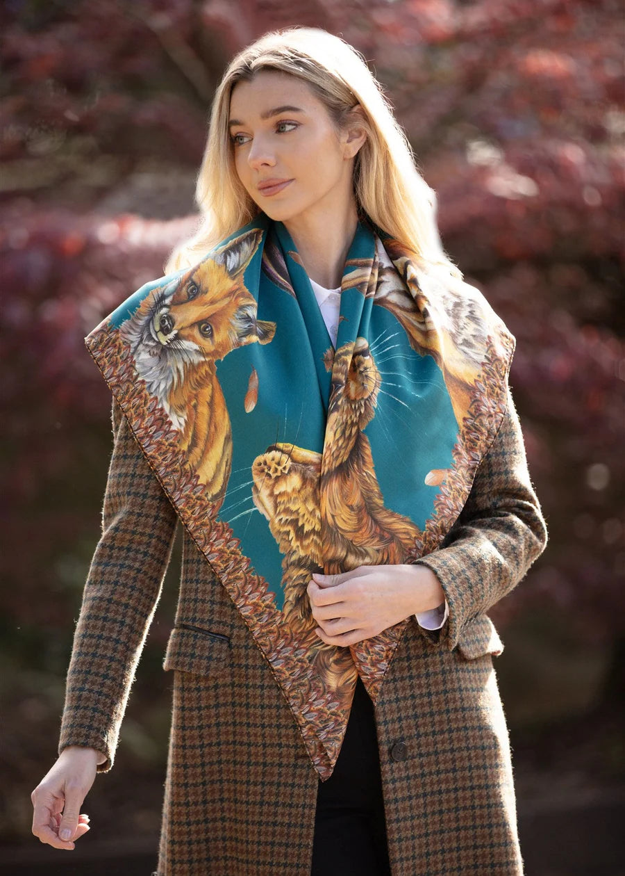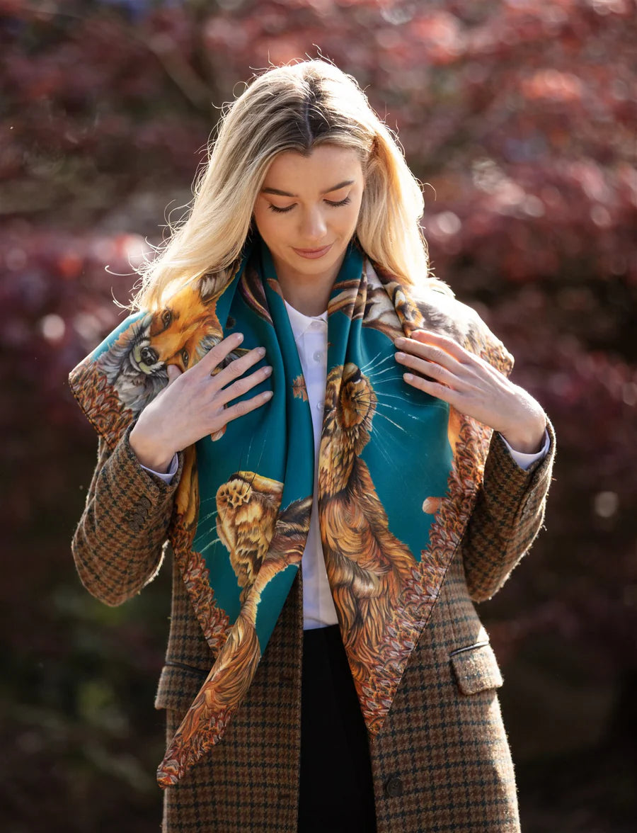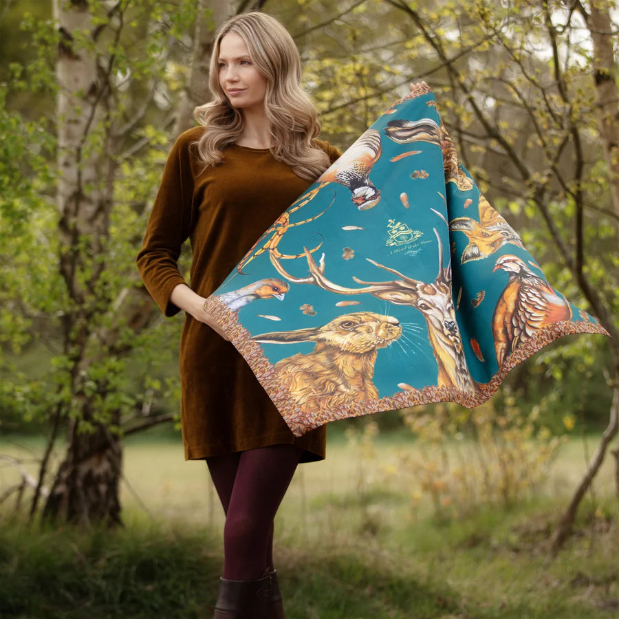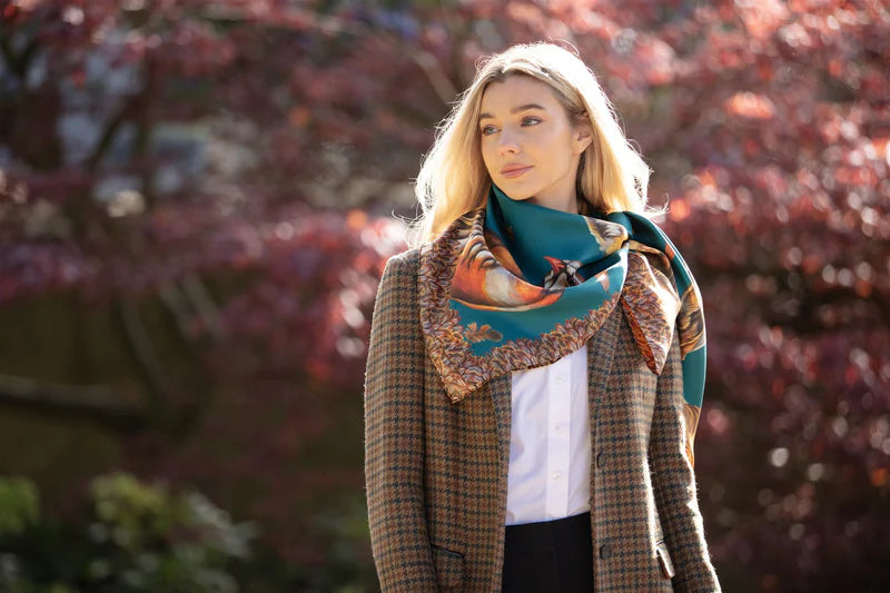 Pheasants, grey and French partridges, the majestic stag (“Caledonia”), hare, snipe, and feather accents all intermingle in this joyous collection. With a striking Teal colourway now available in our luxurious Large Square Pure Silk Scarf, there's no better way to wrap yourself in Autumnal hues.