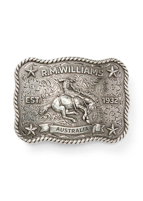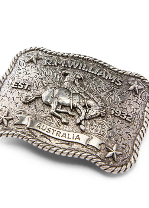 A trophy buckle with an antique silver finish and a design inspired by the iconic cloudbuster image captured by Hoofs & Horns Magazine. This style can be added to the Traditional Belt.