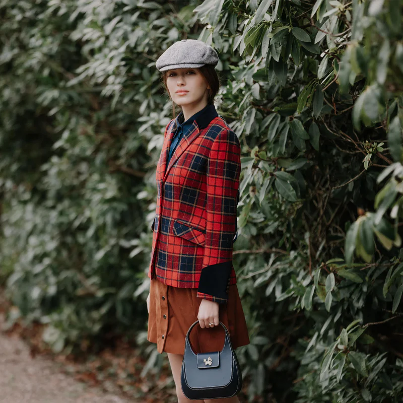 Woven from 100% pure wool, this beautifully fitted jacket captures the romance of the countryside with a touch of modern elegance. The festive checked tweed, in a poetic blend of crimson, navy, and gold, evokes the warmth of winter gatherings and fireside charm. Velvet contrast details at the collar and cuffs lend a whisper of luxury, while the WG signature cuff and engraved buttons add a note of timeless refinement. Gracefully tailored to flatter the form, this piece moves effortlessly from crisp morning walks to candlelit evenings — a celebration of British craftsmanship and enduring style.