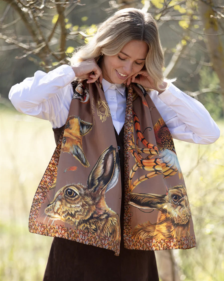 Pheasants, grey and French partridges, the majestic stag (“Caledonia”), hare, snipe, and feather accents all intermingle in this joyous collection. With a warming Mocha colourway now available in our luxurious Classic Pure Silk Scarf, there's no better way to wrap yourself in Autumnal hues.