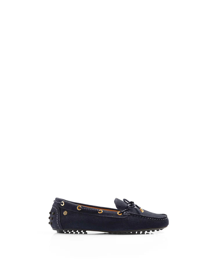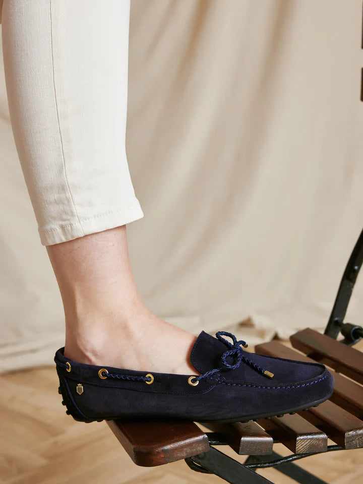 The Fairfax & Favor Henley is their signature driving shoe, crafted with timeless elegance and uncompromising quality. Handmade in Portugal from sustainably sourced suede and leather, each pair features distinctive plaited lace detailing, a reliable rubber grippy sole, and polished light gold hardware including our hallmark shield. The padded insole ensures comfort throughout the day, whether you're behind the wheel or enjoying a relaxed weekend. Available in a curated selection of suede and croc finishes, the Henley pairs effortlessly with any wardrobe for a look that's both refined and versatile.ย