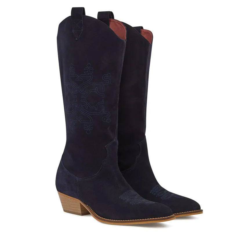 Our timeless Beth Suede Boots now in a rich navy. A classic western-style boot featuring intricate embroidery on the toe and a Cuban heel. This trendy boot is distinguished by our signature lion motif subtly embroidered on the side, along with a debossed lion strip that adds a touch of WG flair. Be prepared to stand out with these exclusive luxury suede boots.