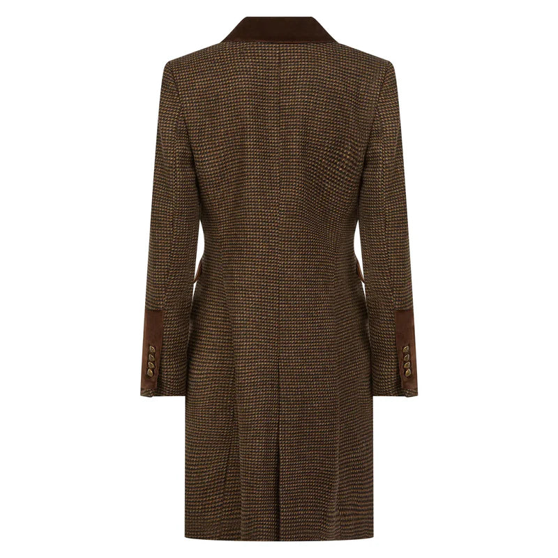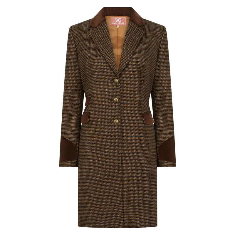 Introducing the Demelza Coat — a timeless classic in a 100% tweed, woven from a rich blend of chocolate brown and black checks. This much-loved silhouette showcases WG’s signature details, including contrast velvet cuffs, collar, and pocket trims, adding an elegant depth to its refined tailoring. Designed in a longer line style with a three-button feature, the Demelza combines sophistication with practicality. Fully lined for comfort and durability, with tailor-stitched pockets for a flawless finish, it’s a coat that embodies understated luxury and heritage charm.